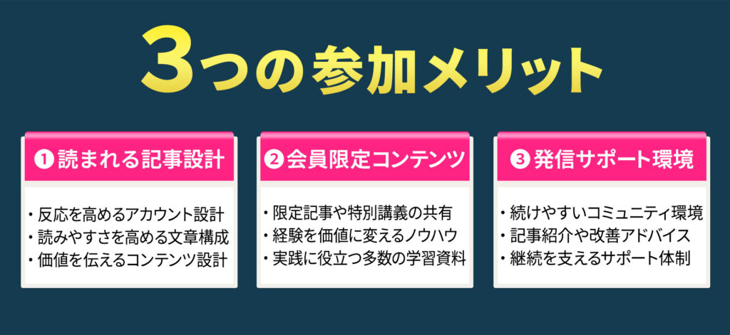 自分の知識や経験を価値に変え、発信を続けながら読者との信頼関係を育て、 収益へとつなげていく仕組みや考え方を共有しています。